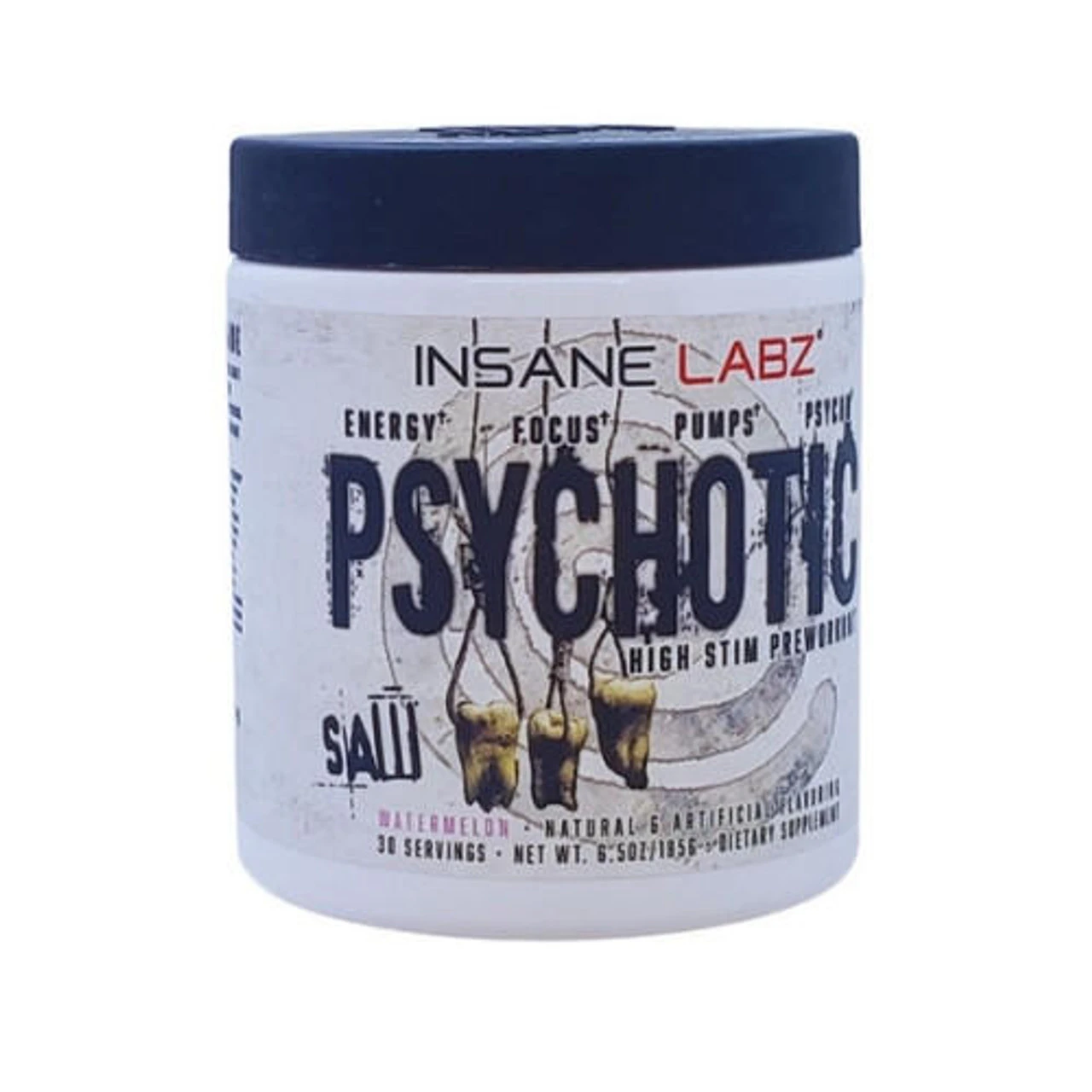 Insane Labz X SAW Psychotic 30 Servings is an all new, limited series, high stim pre-wrokout! This collaborated item will improve brain function, combat fatigue, and support cognitive health/enhanced memory. Insane Labz Psychotic SAW Pre contains Theacrine (as TeaCrine®), CognatiQ®, Beta Alanine, OxyGold and 390mg of caffeine!