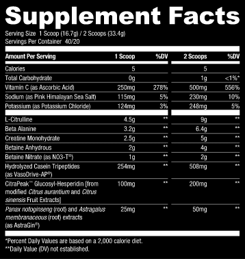 - L-Citrulline (9,000mg) – A large amino acid dose of L-Citrulline will maximize nitric oxide production, enhancing blood flow, endurance, and nutrient delivery to your muscles
